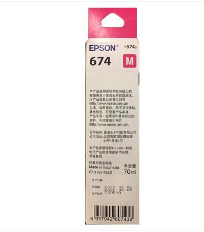 • 商品名称:爱普生(Epson)T6743洋红色墨水补充装 C13T674380(适用于L801)